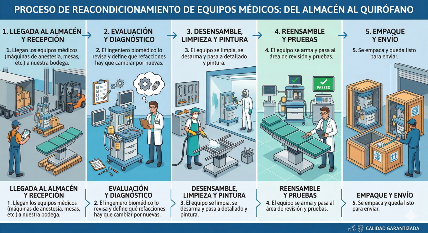 Cada equipo pasa por mantenimiento preventivo y correctivo, reemplazo de refacciones necesarias y pruebas funcionales, garantizando seguridad, confiabilidad y óptimo desempeño clínico.